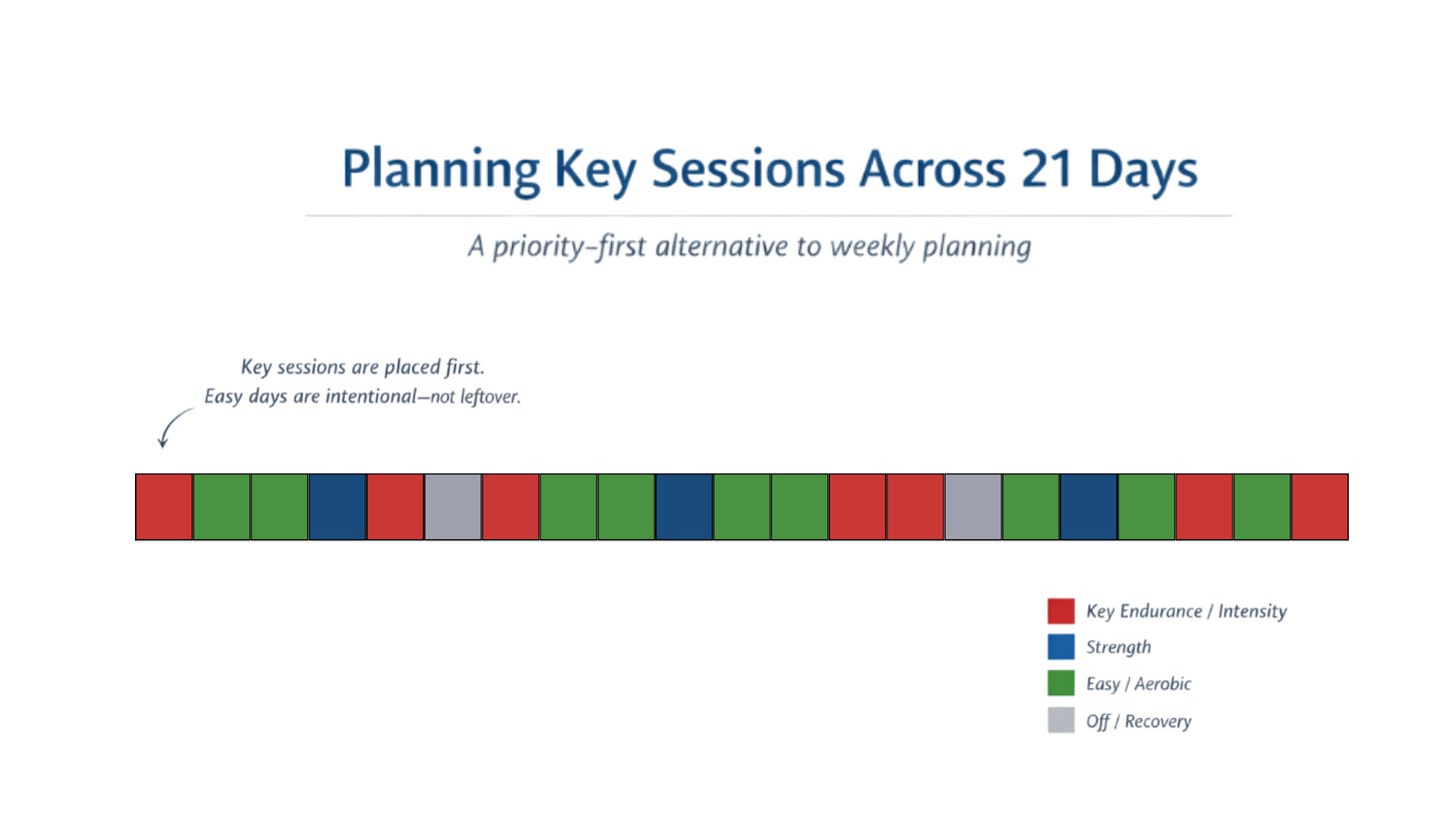 Instead of starting with total weekly volume and then trying to squeeze long or hard sessions into the calendar, begin by identifying a small number of key days across that 21-day span.